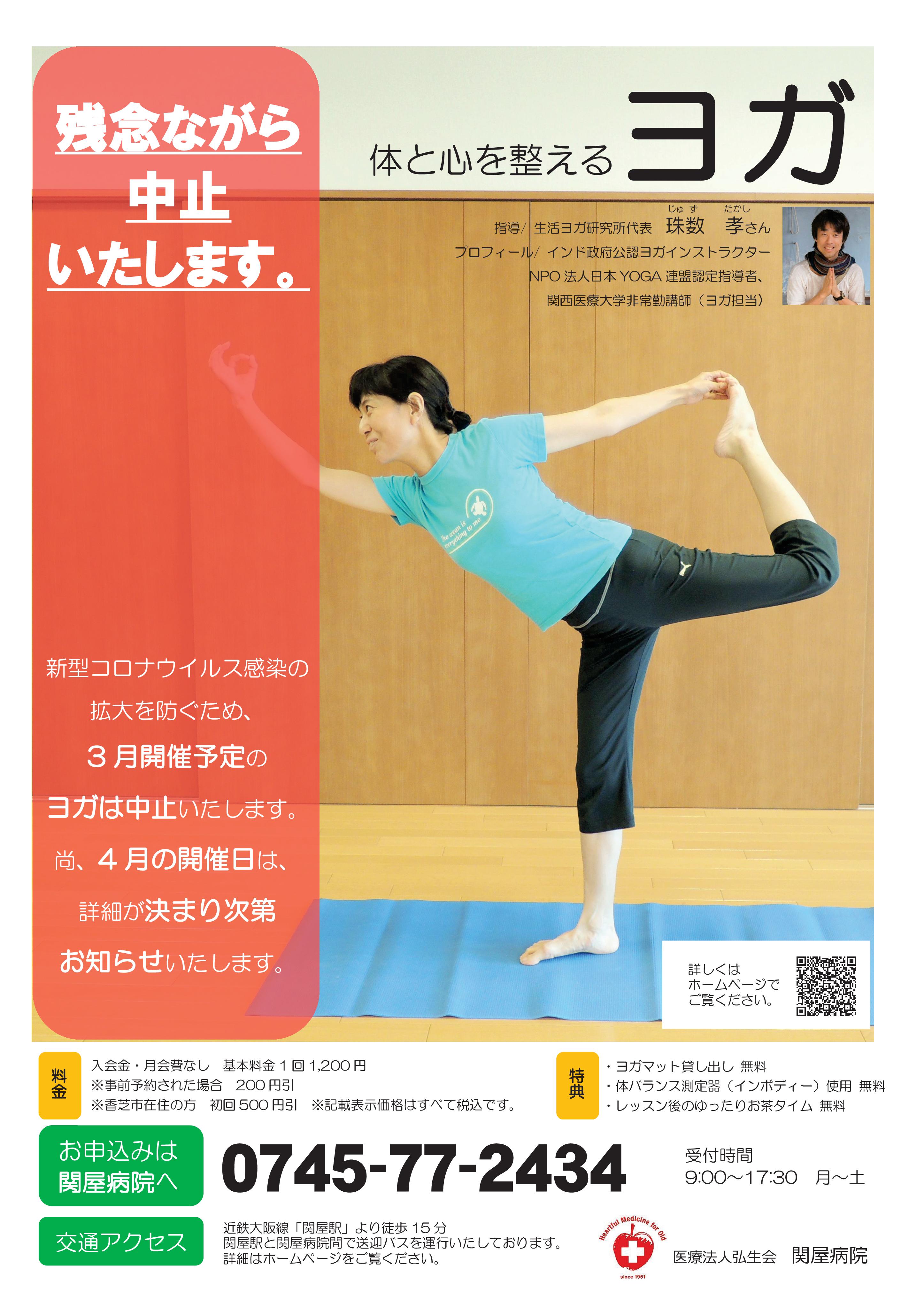 3月のヨガ、中止のお知らせ。 2020.02.25 お知らせ 新型コロナウイルス感染防止のため、3月のヨガを中止することにいたしました。ヨガを楽しみにしていただいている皆さまにとって残念なお知らせとなってしまい、大変申し訳ありません。新型コロナウイルス感染状況を注視し、収束に向かうことを確認してから、ヨガを再開いたします。今後の開催日は決まり次第、ホームページでご連絡いたしますので、どうぞよろしくお願いいたします。