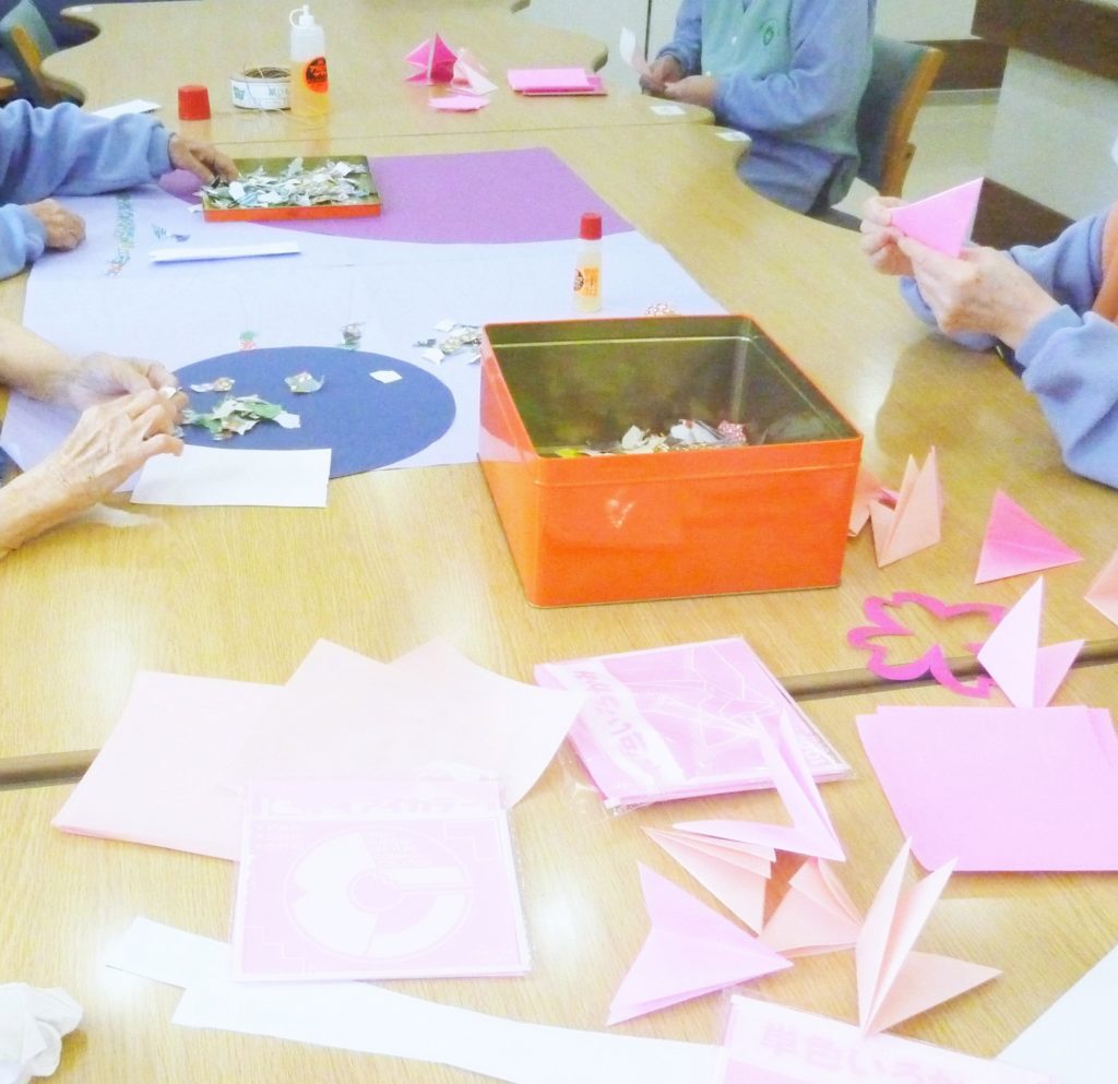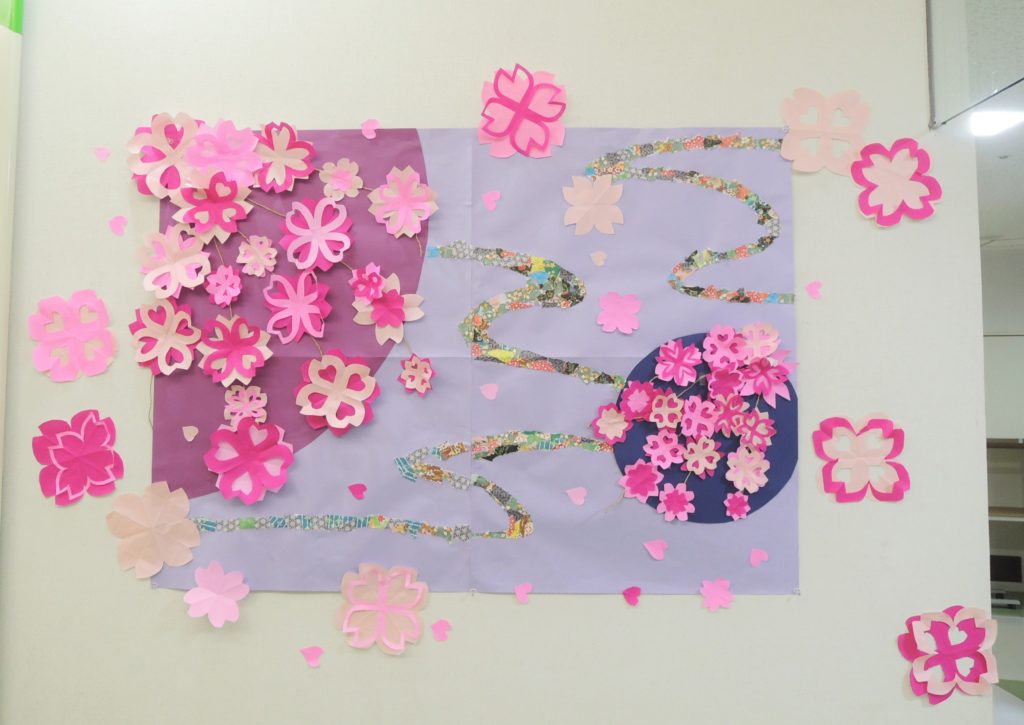 3月の壁飾り。~ふたかみ棟1階~ 2020.03.11 お知らせ 桜の形に折り紙を折り、のりで貼って壁飾りを作成していただきました。参加してくださった患者さまは「また作りたい」と喜んでおられました。 関屋病院ニューズレター「りんご便り3月号」より