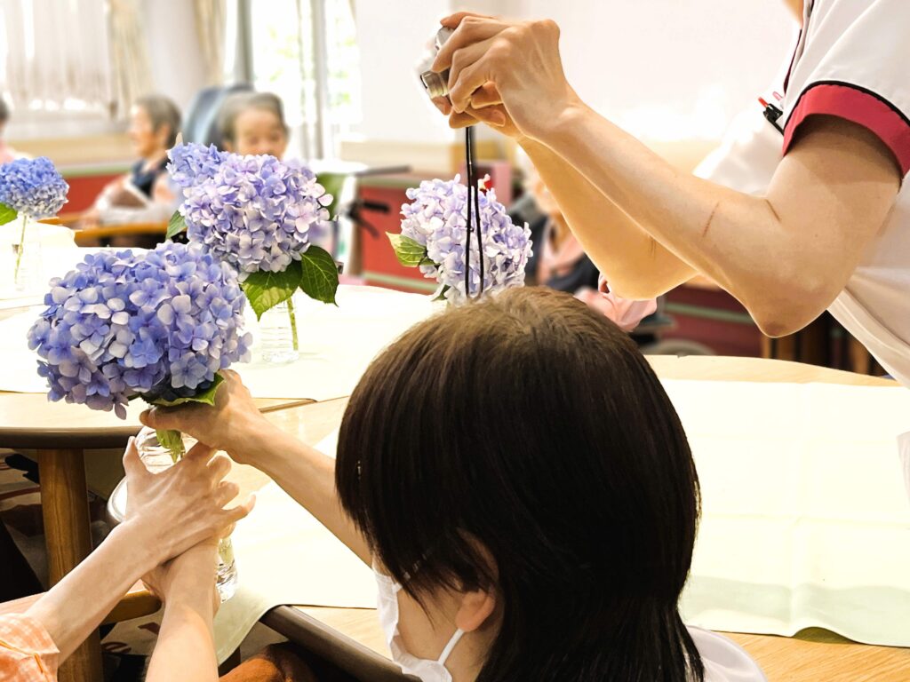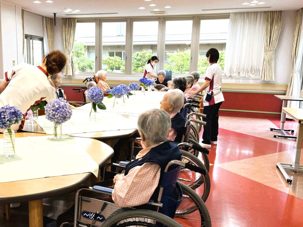 デイルームのテーブルに庭園のあじさいを飾り、