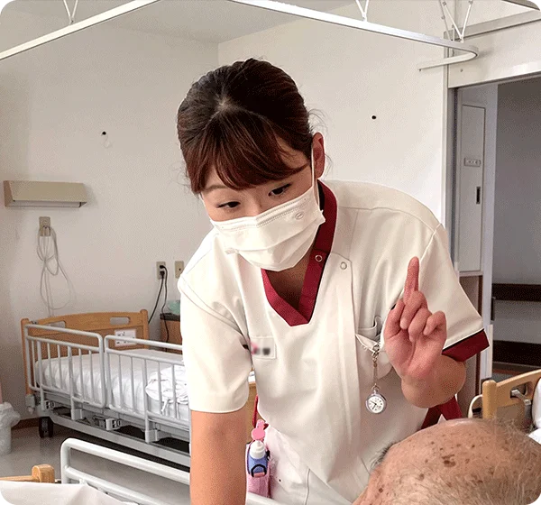 急性期病院では受け持っている患者さまがすぐに退院されますが、療養型病院の患者さまは長期で入院されています。「元気がない」「食欲がない」「しゃべり方が少し違う」など、受け持ち患者さまの昨日と今日の変化に気づきやすく、それに対して看護師もケアワーカーも素早く対応できるところが当院の特徴だと思います。